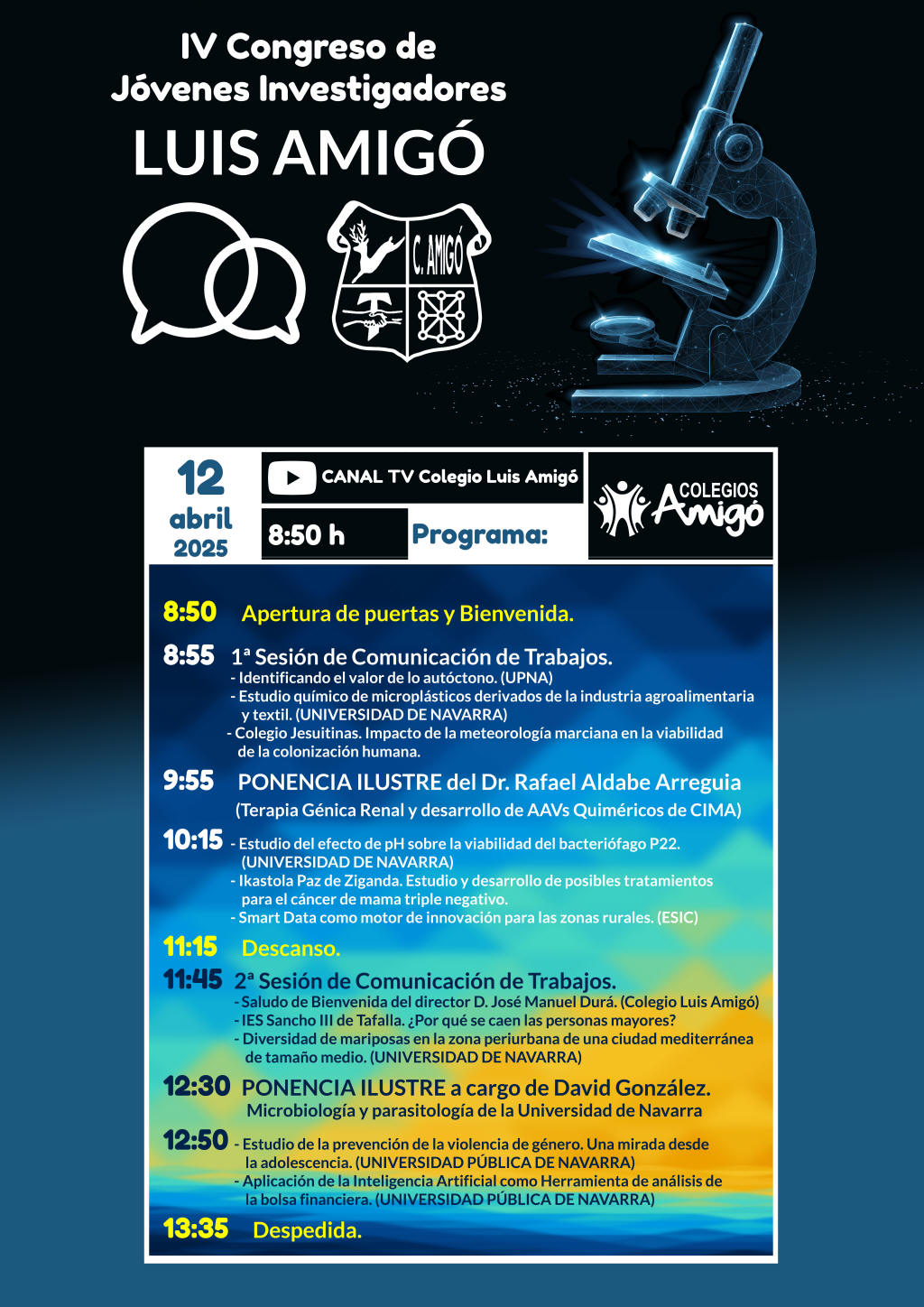 · El Sábado 12 de abril 2025 fue la fecha escogida para celebrar nuestro IV CONGRESO de Jóvenes Investigadores LUIS AMIGÓ 2025, un evento ya consolidado dentro del Bachillerato de Investigación que ofrecemos en el Colegio Luis Amigó. Una cita que pone en valor el trabajo, el compromiso y la curiosidad científica de nuestro alumnado. Durante la jornada, los y las estudiantes presentaron los proyectos de investigación que han comenzado a desarrollar este curso. Sus trabajos abarcan distintas áreas del conocimiento y suponen el primer paso hacia una experiencia académica más profunda y rigurosa. |