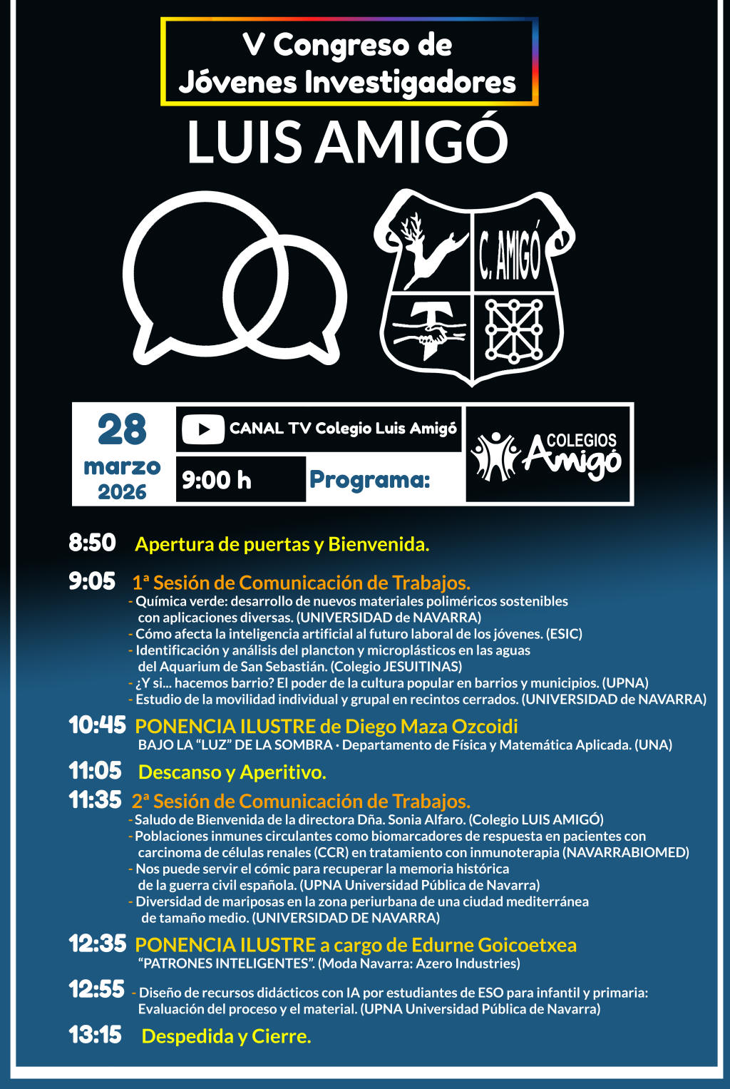 ˇ El Sábado 28 de marzo 2026 es la fecha escogida para celebrar nuestro V CONGRESO de Jóvenes Investigadores LUIS AMIGÓ, un evento ya consolidado dentro del Bachillerato de Investigación que pone en valor el trabajo, el compromiso y la curiosidad científica de nuestro alumnado. |